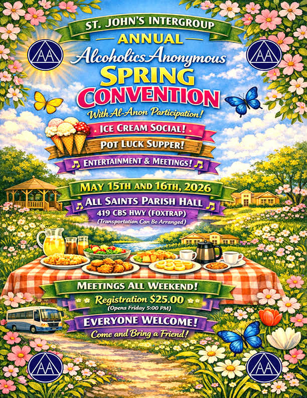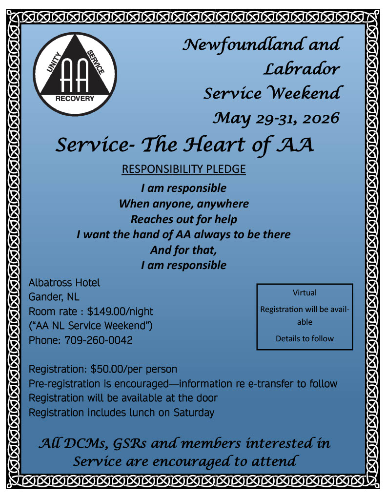 Please find the attached flyer (click red NL Service Weekend) announcing the NL Spring Service Weekend. The meeting will be held in Gander from May 29-31st. Group GSRs are encouraged to attend , but it is open to all A.A. members. Please submit items for the Agenda prior to March 6th. Items should be sent directly to the Area Chair: chair@area82aa.org
